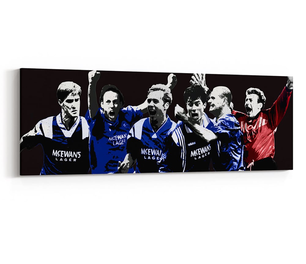 A Special 20th Anniversary tribute to Rangers' Nine In A Row Legends, Richard Gough, Mark Hateley, Ally McCoist, Paul Gascoigne, Brian Laudrup and Andy Goram set on a black background.